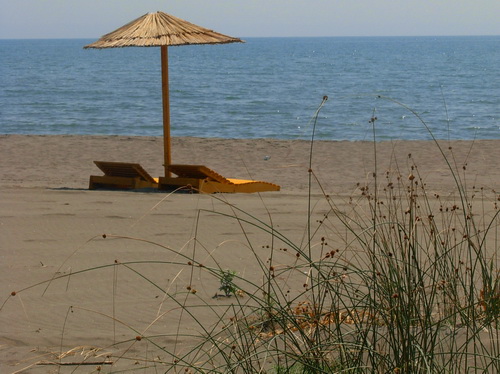 Муниципальный, белый песок, мелкая галька. Лежаки и зонты платно .