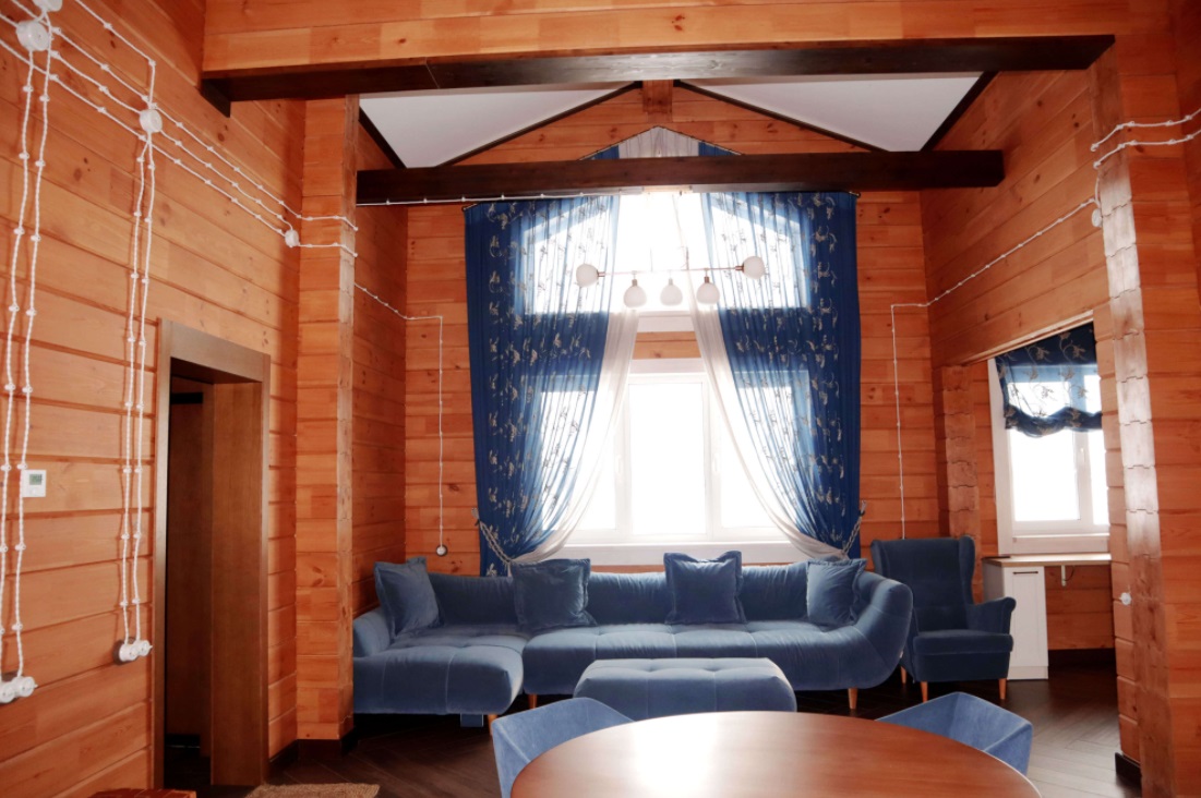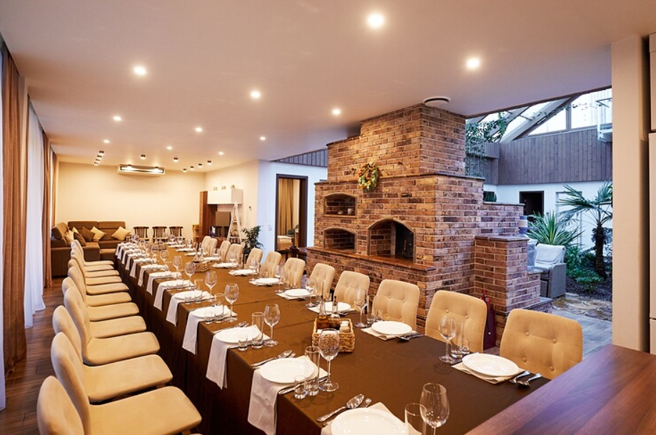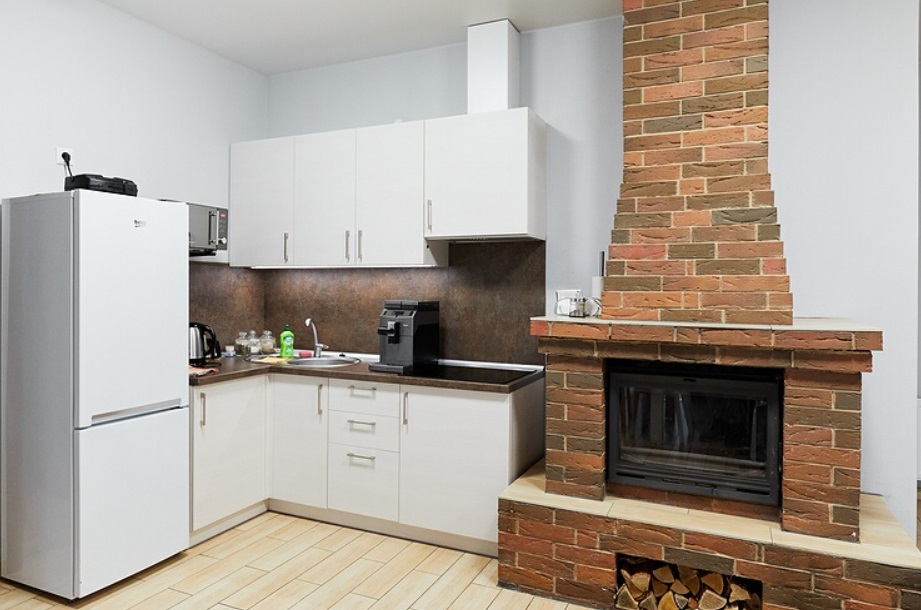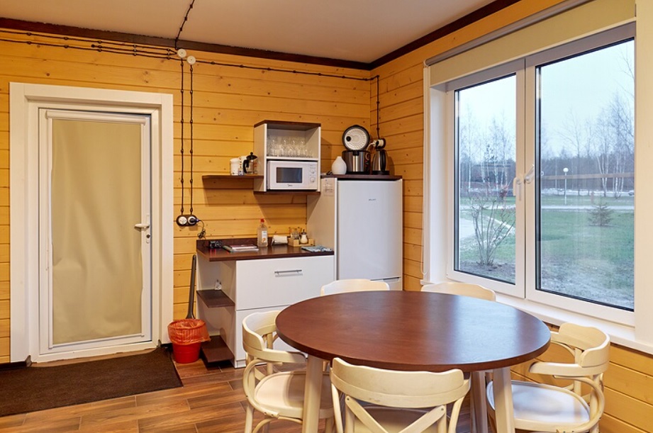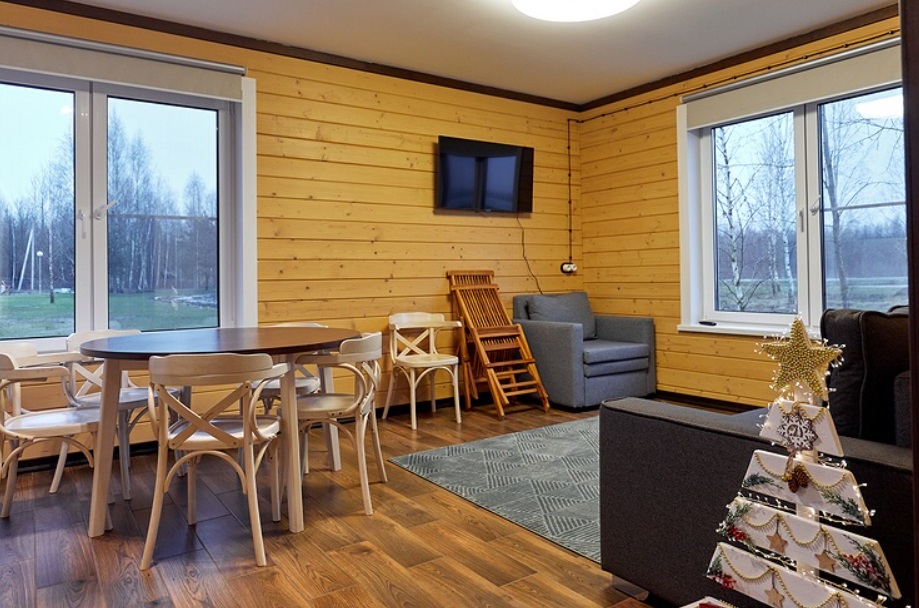 - Кухня-гостиная: холодильник, электроплита, духовая печь, микроволновая печь, посудомоечная машина, кофе машина, чайник, тостер, набор посуды для приготовления еды, набор посуды для сервировки на 30 персон, стол, стулья, русская печь, камин, TV, диван.