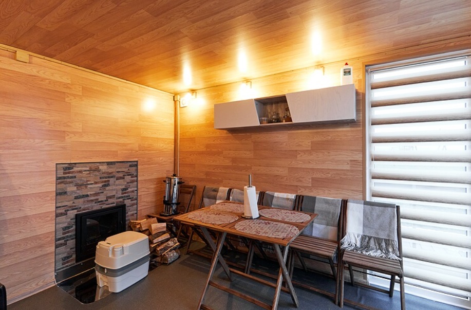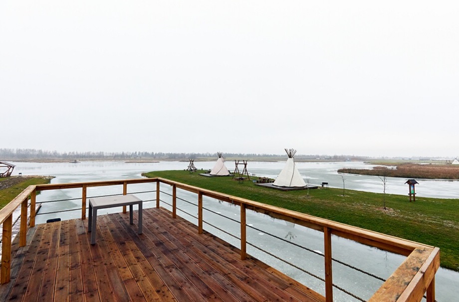 - Баня в Eco Holiday Village: вмещает до 10 человек, есть комфортная зона для отдыха и чаепития, душ / ведро-душ на улице, большая терраса с видом на озеро Надежды и глэмпинг, полотенца + веники и банные принадлежности.