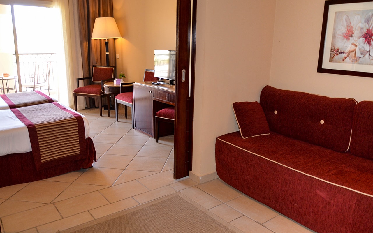 Deluxe Family Sea Side — номер зонированный раздвижной межкомнатной дверью на две спальни (см. фото). В первой спальне — king size bed или twin beds. В спальне для детей — две софы 0.85 м х 1.90 м | зона проходная, окна нет. Дополнительное спальное место не предусмотрено. Частичный вид на море (seaside view).