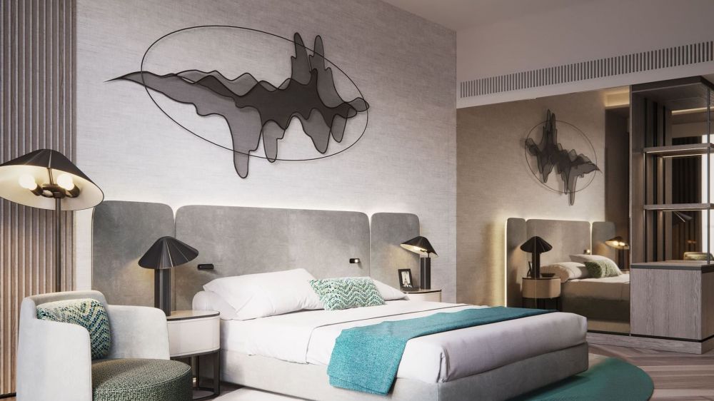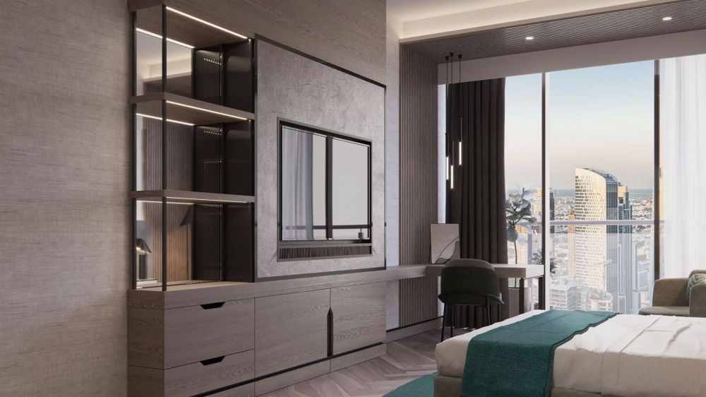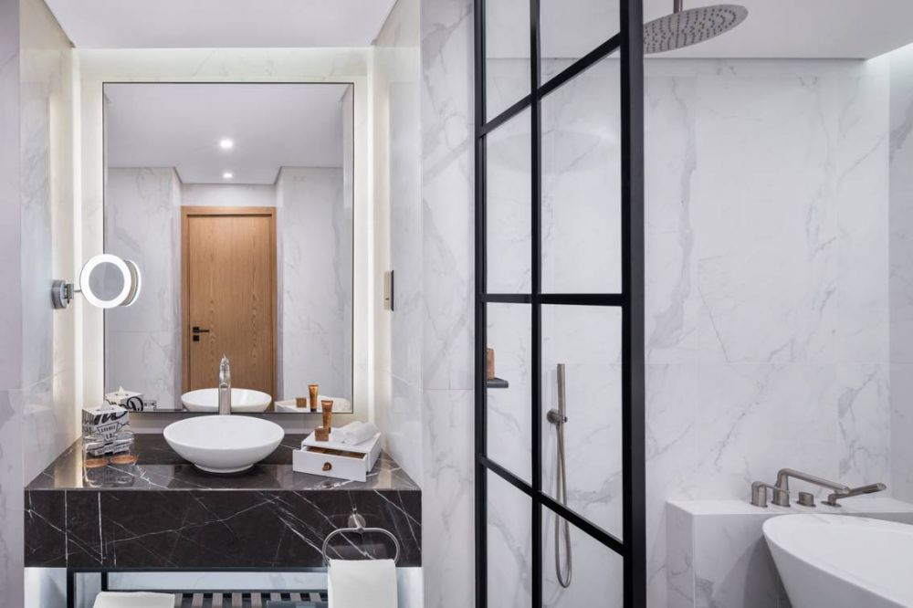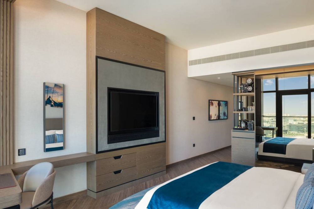 Scene Room Coastal View - 40-51 м², макс. 2+1 infant чел., вид на дорогу Шейха Заида и побережье Дубая | спальня (king-size), ванная комната с душем
