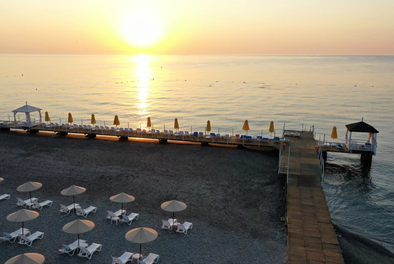 Собственный песчано-галечный пляж находится рядом с отелем.