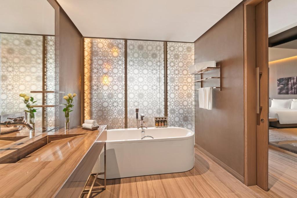 One Bedroom Deluxe Suite - площадь 84 -94 кв.м., располагаются с 5 по 34 этажи, две комнаты, гостиная, спальня, межкомнатная дверь, диван, ванная комната, балкона нет, вид на город.
