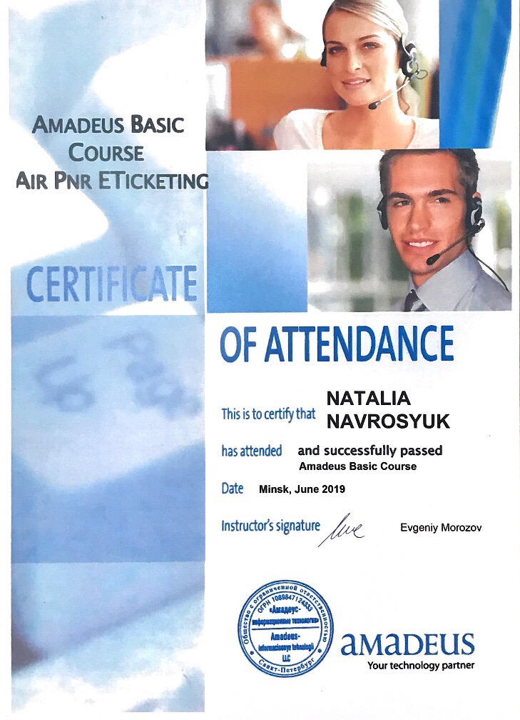 Наталья Левчук, наш специалист, награждена сертификатом по выписке авиабилетов в системе бронирования Amadeus.